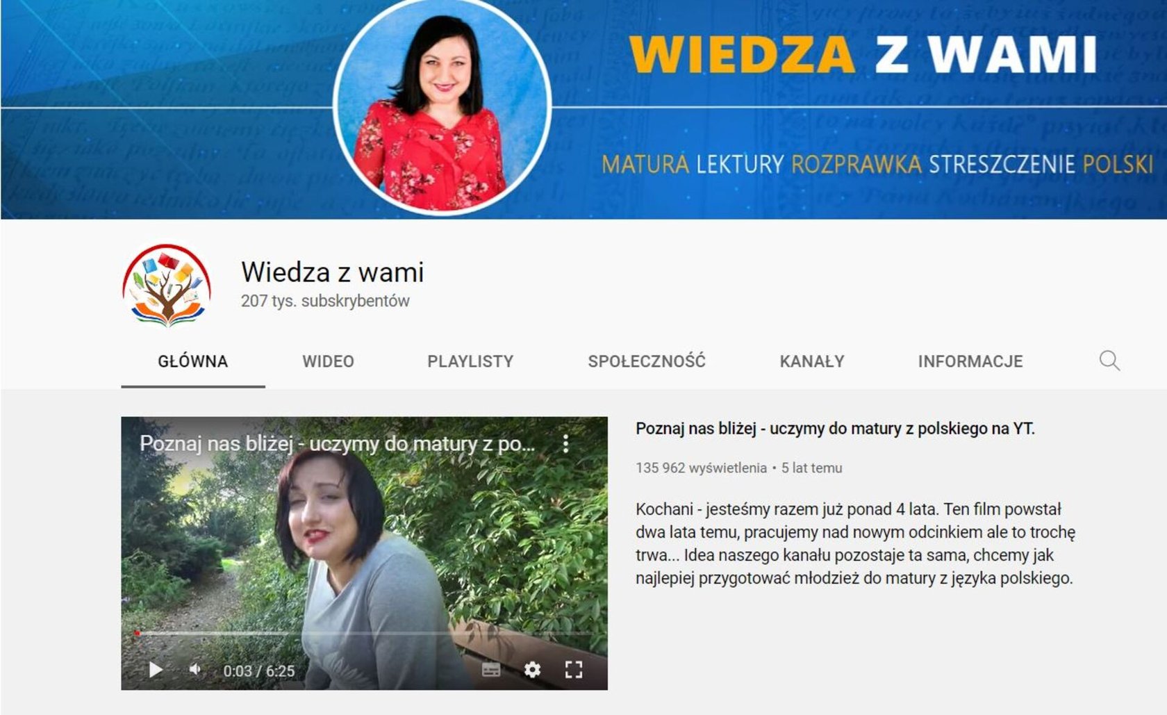 Wiedza z wami to kanał, który zawiera interaktywne lekcje przygotowujące do egzaminu maturalnego z języka polskiego. Oglądając filmiki dowiesz m.in. jak napisać wypracowanie czy rozprawkę. Poznasz również epoki literackie, a także streszczenia i opracowania wymaganych lektur - ?Lalki?, ?Pana Tadeusza? lub ?Wesela?.