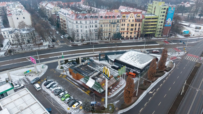 Widok na działkę z budynkami przeznaczonymi do rozbiórki: stacją paliw, restauracją i pawilonem (luty 2026)
