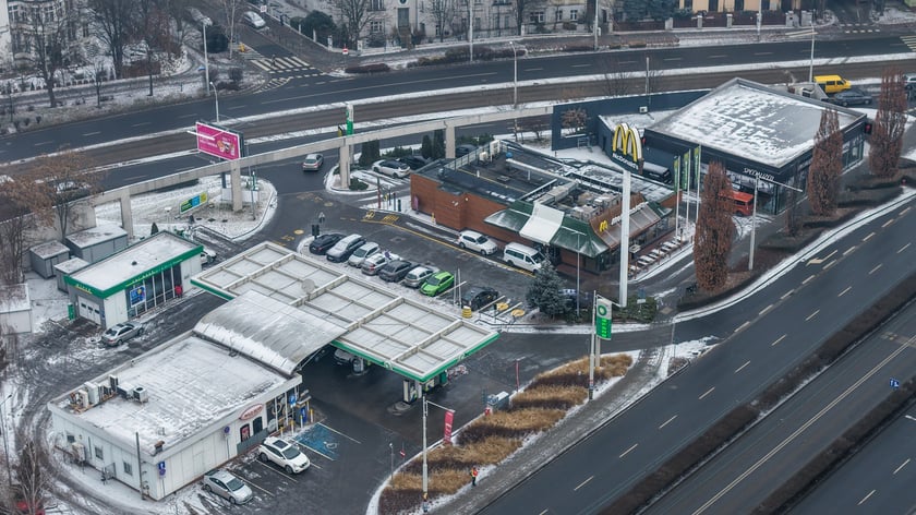 Widok na działkę z budynkami przeznaczonymi do rozbiórki: stacją paliw, restauracją i pawilonem (luty 2026)