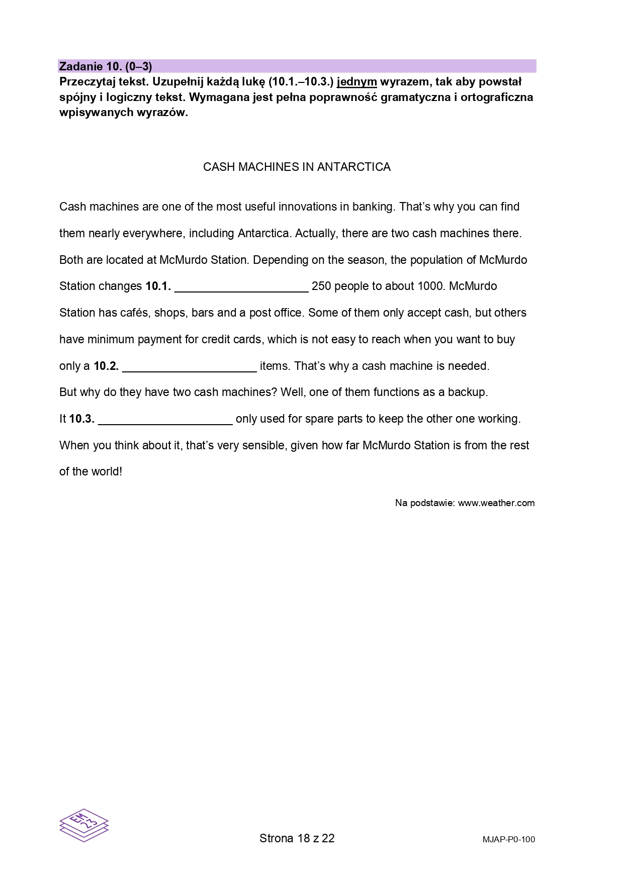18 / 23 Wróć do artykułu Próbna matura 2026 z języka angielskiego. Arkusz CKE Próbna matura 2026 z języka angielskiego. Arkusz CKE materiały CKE Przejdź do poprzedniego zdjęcia. Poprzednie Następne Przejdź do kolejnego zdjęcia. Arkusz próbnej matury z języka angielskiego 2026