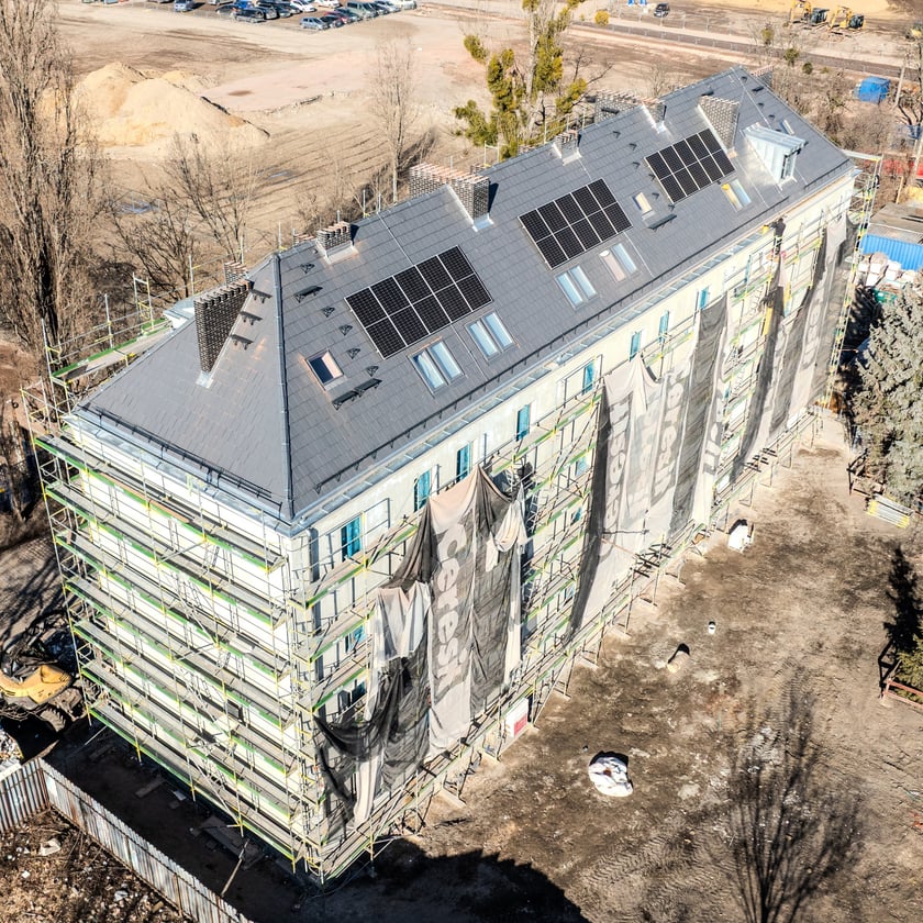 Remont budynku na Wilczej 1-3-5. Na dachu zamontowano panele fotowoltaiczne - to pierwsza tego typu inwestycja gminna