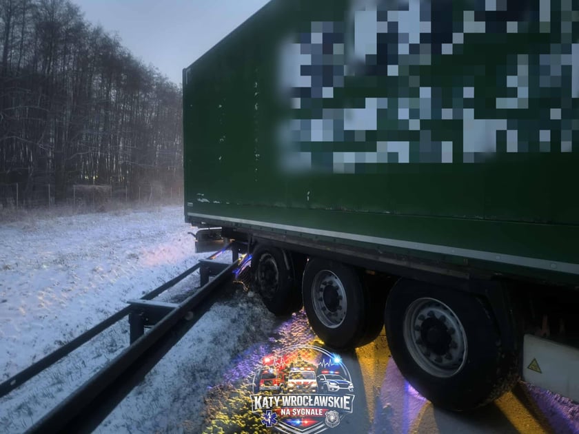 Ciężarówka stoi w poprzek jezdni i blokuję autostradę A4 w rejonie węzła Kąty Wrocławskie