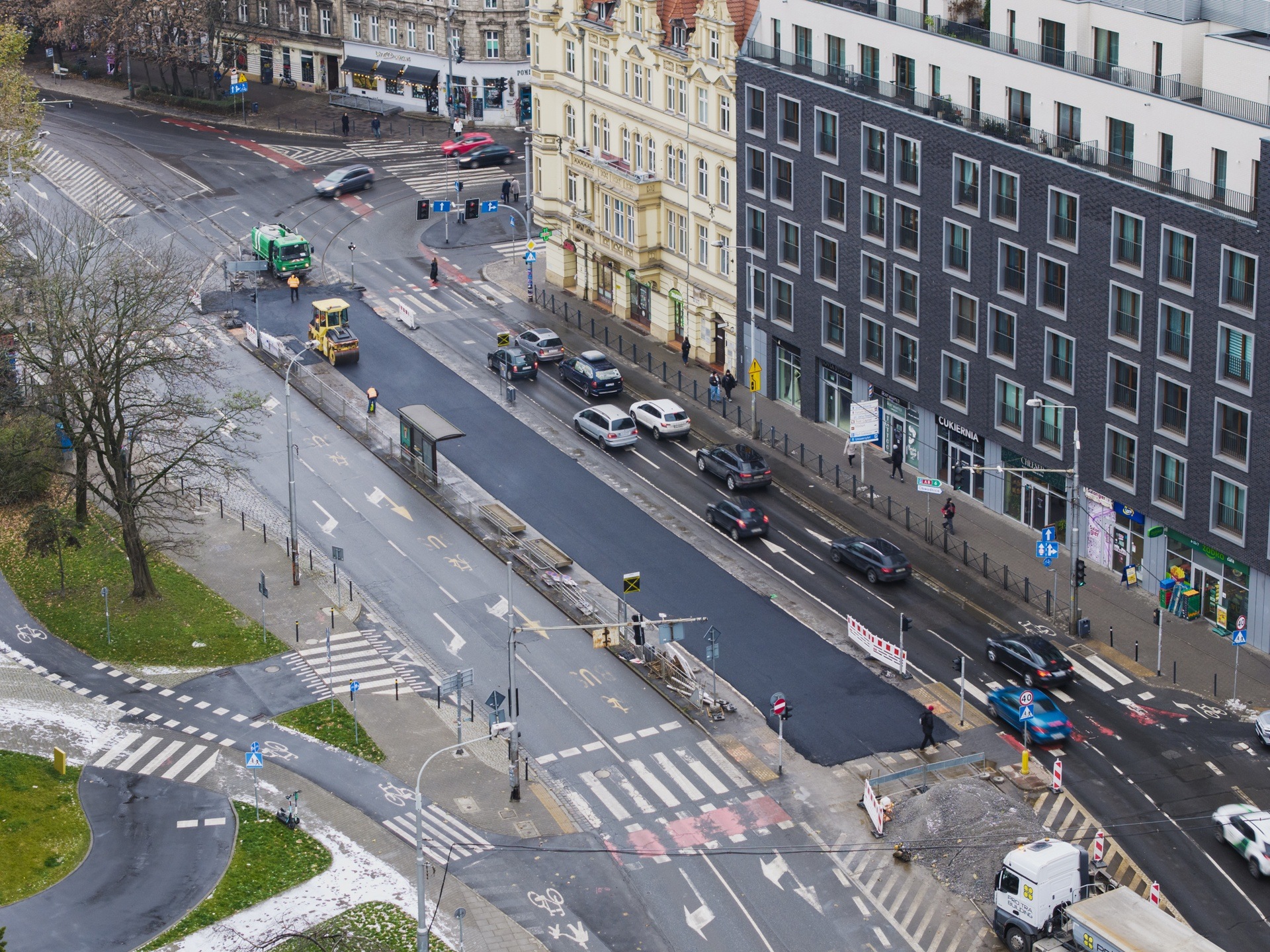 W poniedziałek 24 listopada wykonawca kładł masę bitumiczną w miejscu torowiska. Tak powstaje tymczasowa jezdnia, którą wkrótce będą jeździć kierowcy