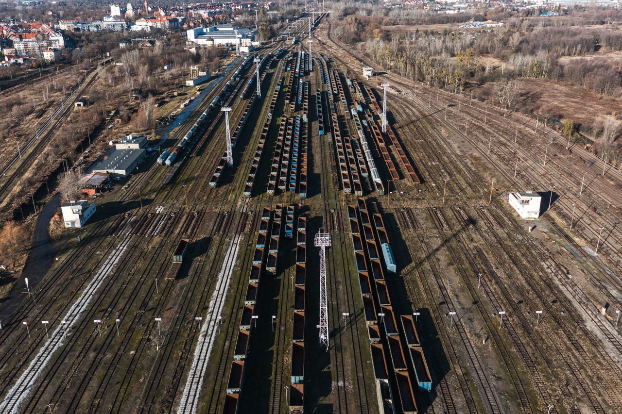 Wagony kolejowe stoją na bocznicy na wrocławskim Brochowie. Widok z drona