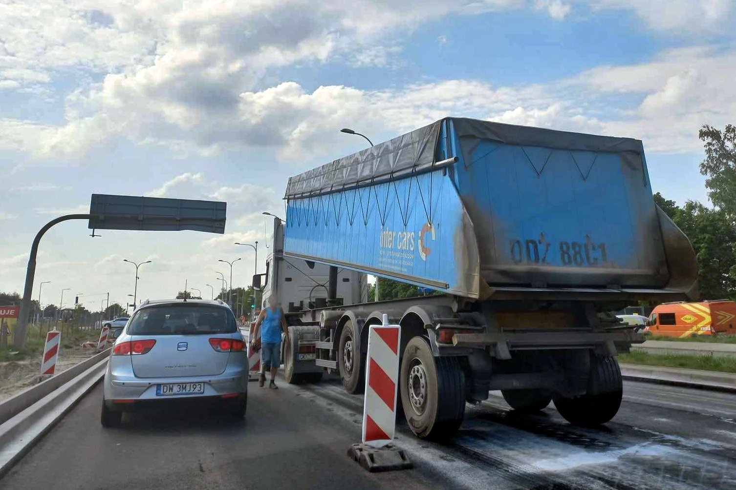 Na ul. Kosmonautów trwają prace budowlane, robotnicy układają masę bitumiczną.