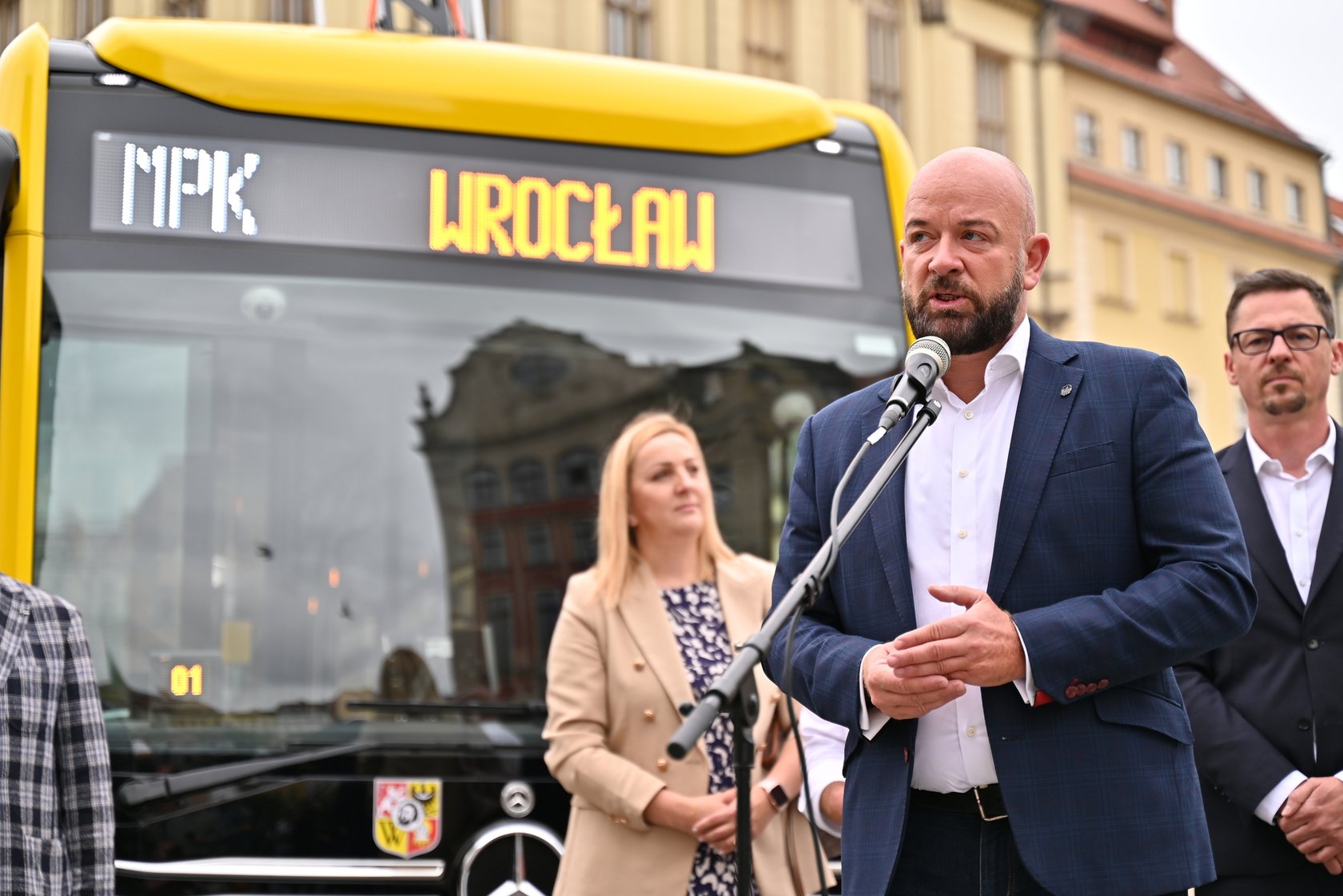 Prezentacja pierwszego elektrycznego autobusu zakupionego przez MPK Wrocław. Prezydent Wrocławia Jacek Sutryk.