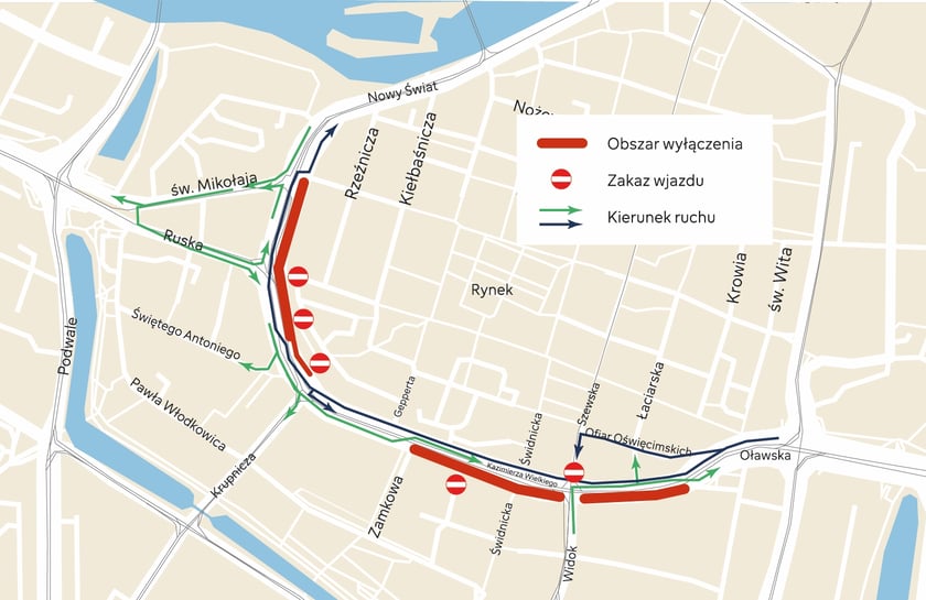 Mapa z organizacją ruchu samochodowego podczas pierwszego etapu remontu na Kazimierza Wielkiego