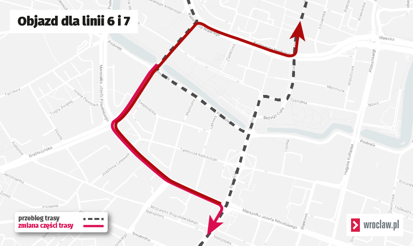 Tramwaje linii 6 i 7 jadące z pętli Kromera do pętli Krzyki, zostaną skierowane objazdem od ulicy Krupniczej przez ulicę Sądową, plac Legionów i ulicę Piłsudskiego do ulicy Świdnickiej.