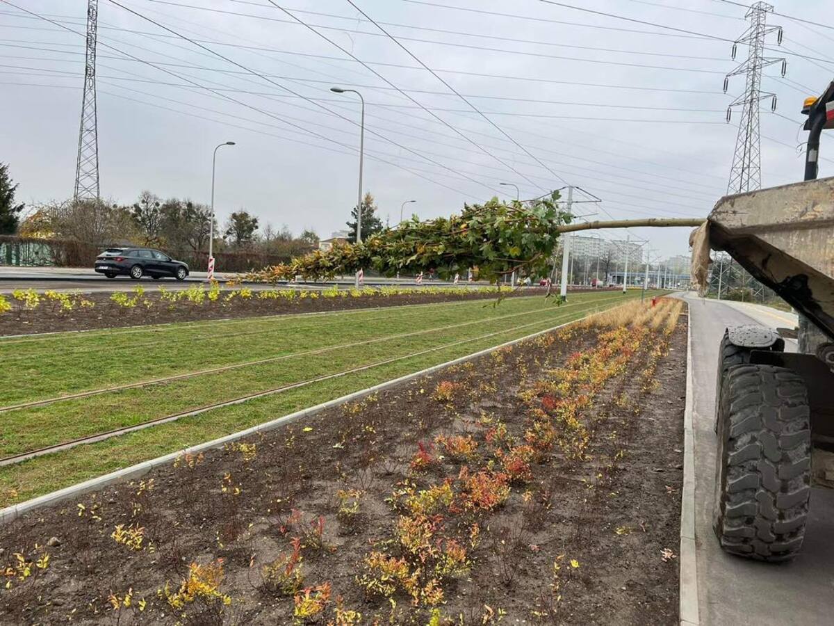 Na zdjęciu nowe krzewy, drzewa i rozchodnik na budowanej linii tramwajowej z centrum miasta w stronę Popowic